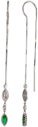14k White Gold Diamond Threader Earrings, w/ 0.04 Carat Brilliant Cut Diamonds & 0.44 Carat Marquise Cut Emerald Stones, 2 3/8 by