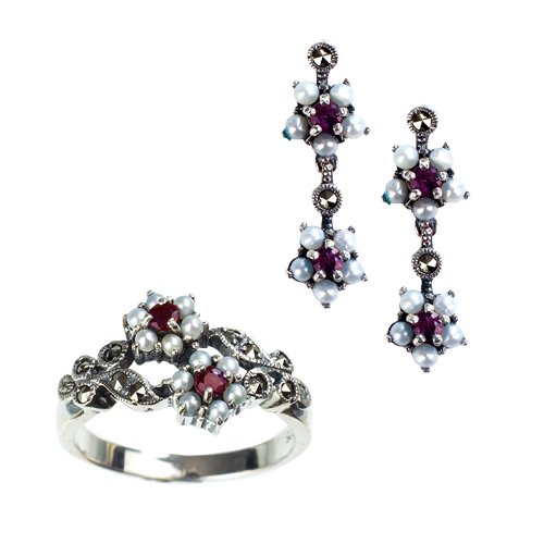 Gemini Silver Natural Seed Pearl Earrings & Ring Set (Size 9), Ruby - Dahlia Vintage Collection Feature